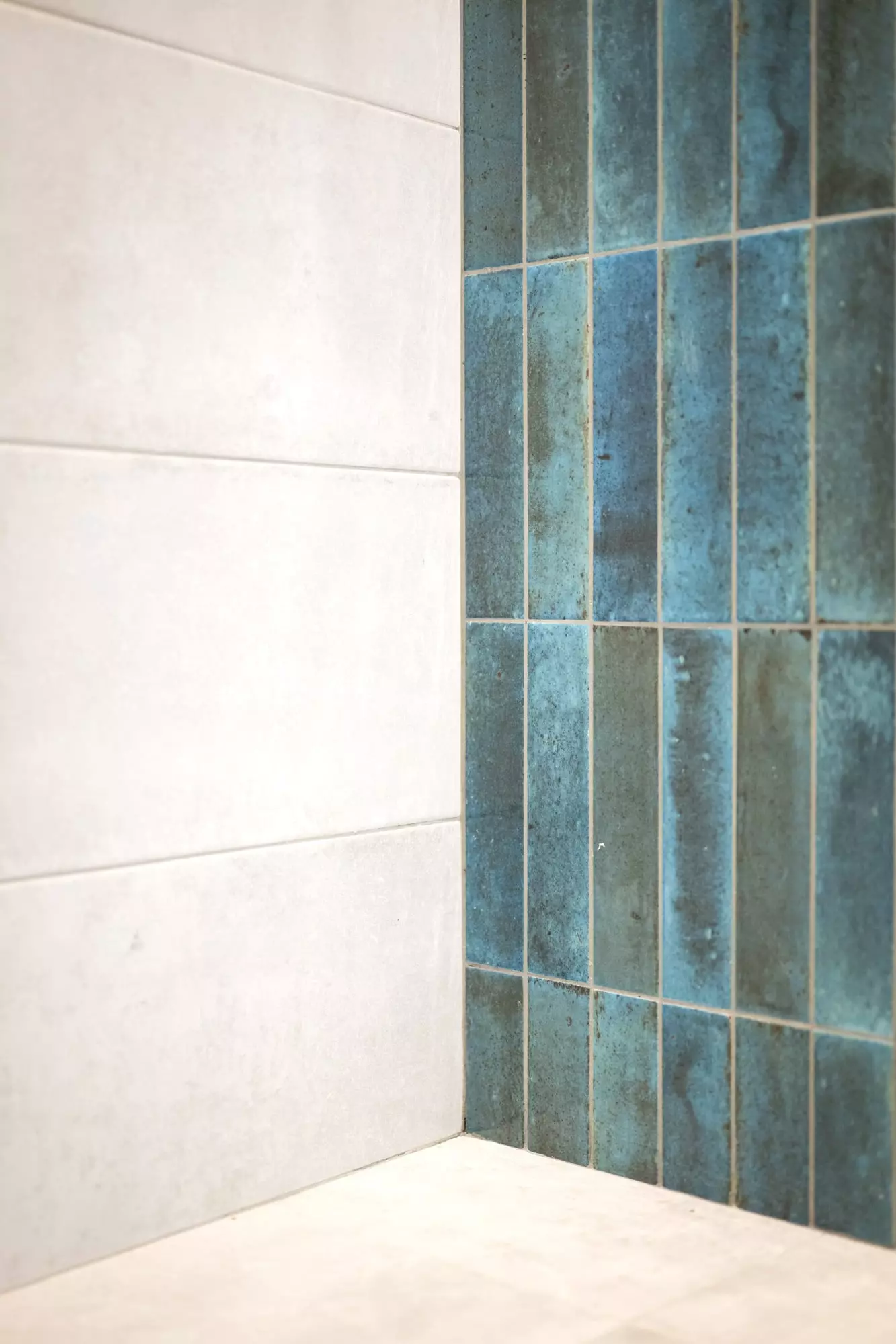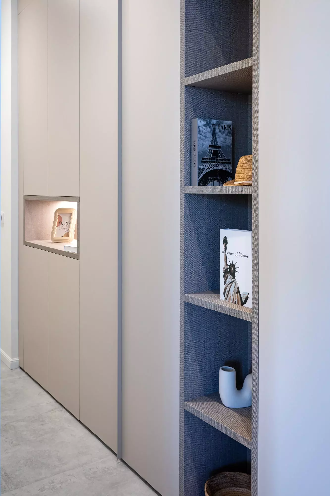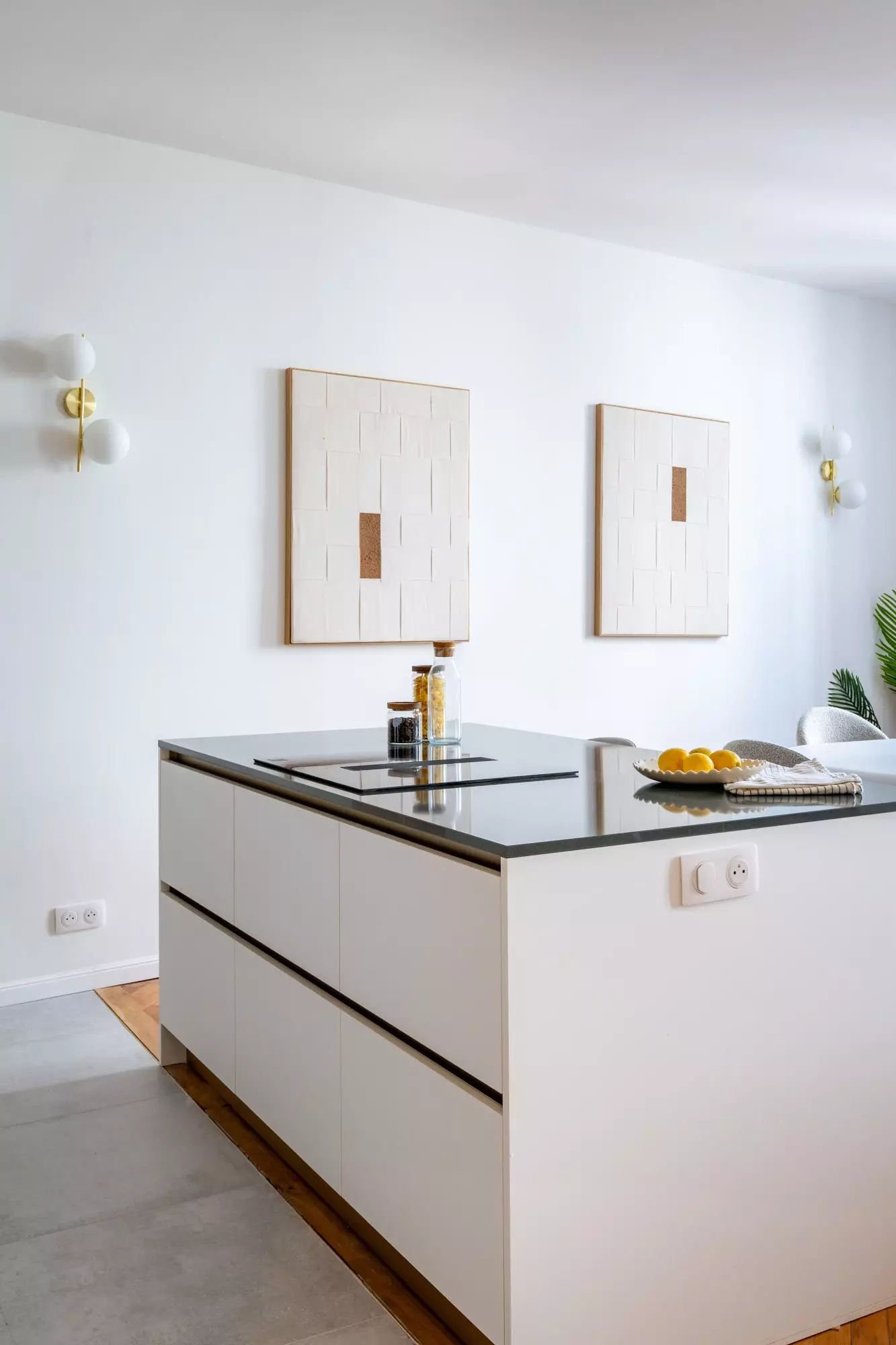 Dès l’entrée, un placard sur-mesure a été imaginé pour accueillir manteaux et accessoires, tout en intégrant discrètement le tableau électrique et le chauffe-eau. Ce souci du détail reflète notre approche : chaque aménagement répond à une logique esthétique et fonctionnelle. Le parquet en point de Hongrie d’origine a été restauré pour révéler le caractère bourgeois du lieu, tandis que de grands carreaux contemporains remplacent les anciens sols, créant un contraste élégant entre tradition et modernité.