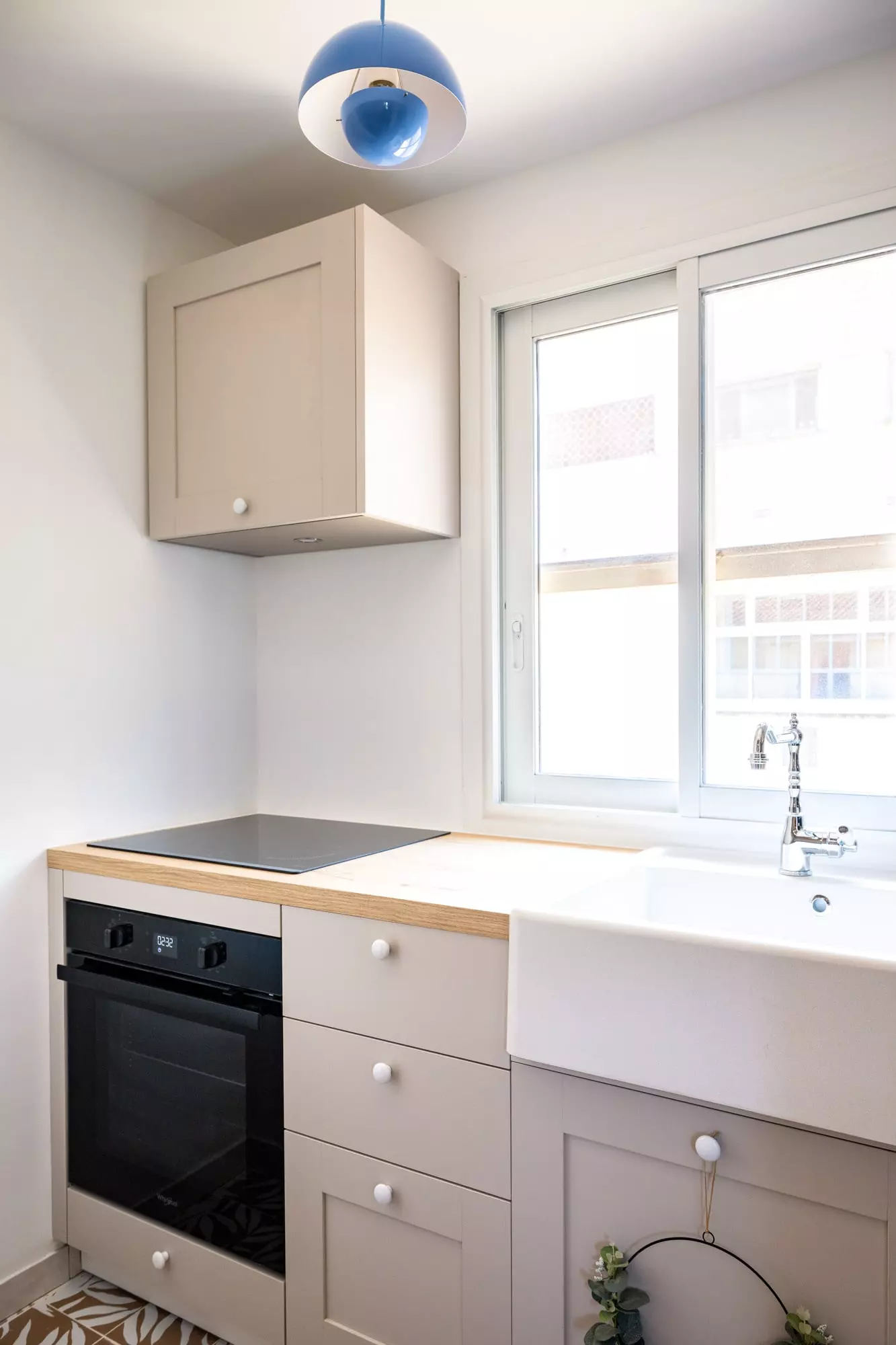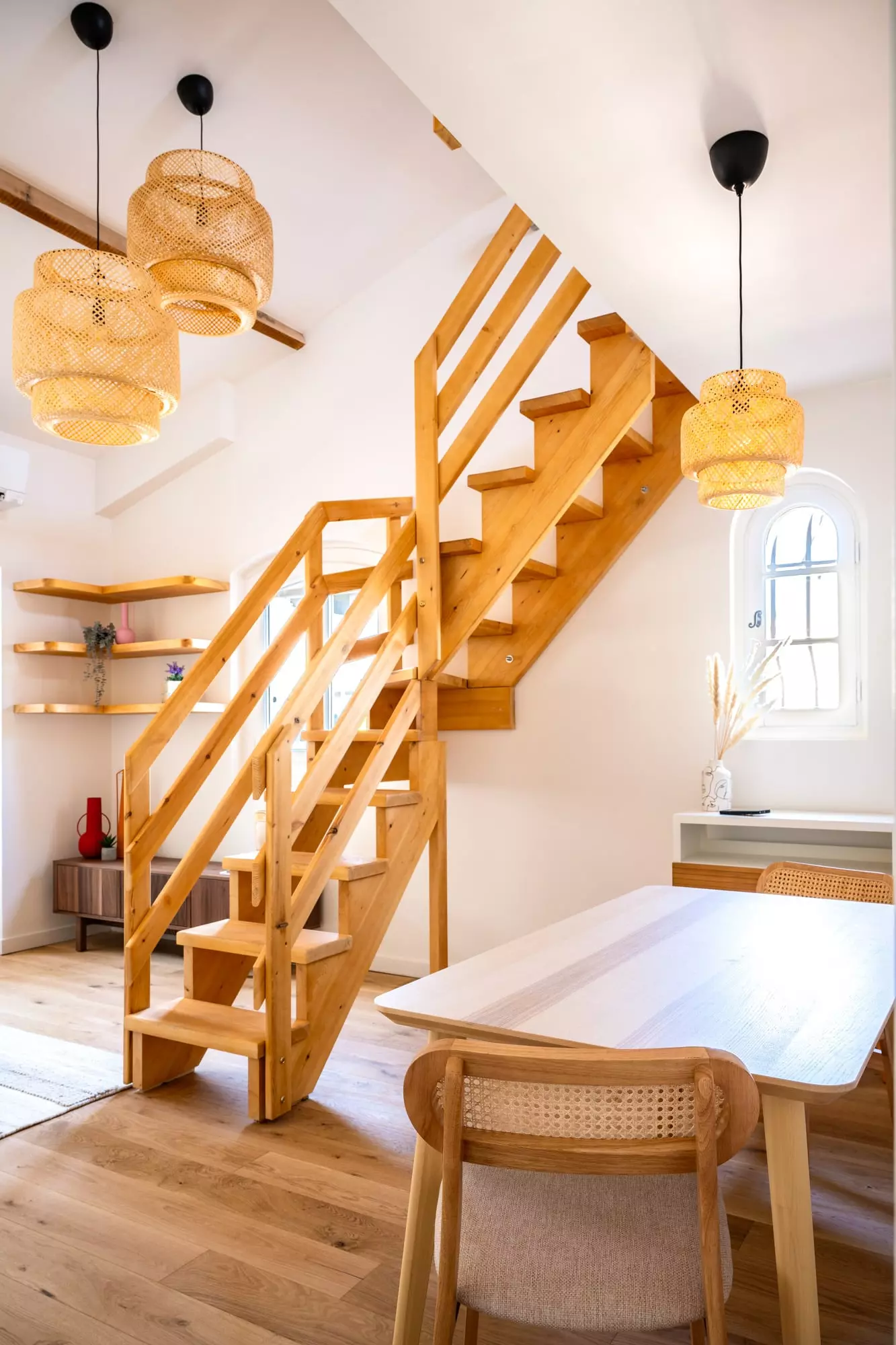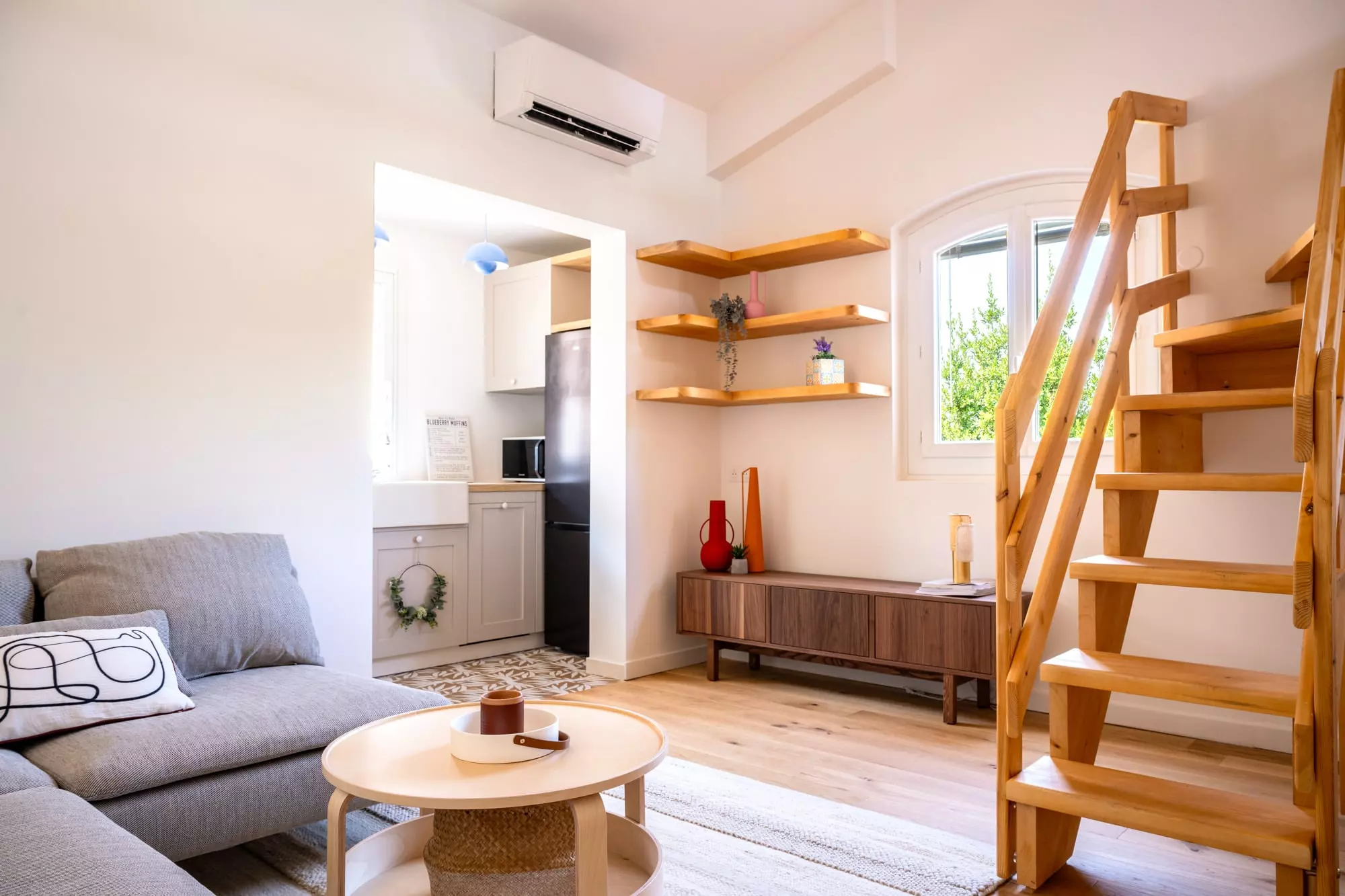 La cuisine a été entièrement repensée pour devenir un espace fonctionnel et élégant, tandis que la salle de bain a fait l’objet d’une rénovation maison ancienne Alpes-Maritimes, mariant zelliges et tomettes inspirées de l’artisanat méditerranéen. Ce mélange subtil confère à l’appartement une identité singulière, harmonieusement. où authenticité et modernité dialoguent. La mezzanine accueille désormais une chambre supplémentaire avec lit double, tandis que la pièce principale conserve une fonction conviviale et lumineuse. La chambre principale, non présentée en photo, intègre un bureau, un grand placard et un deuxième couchage double.