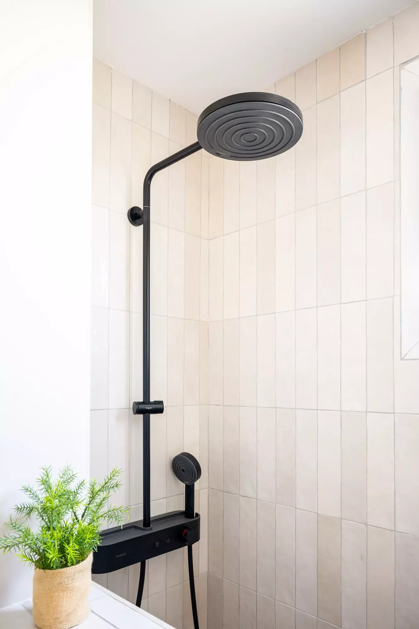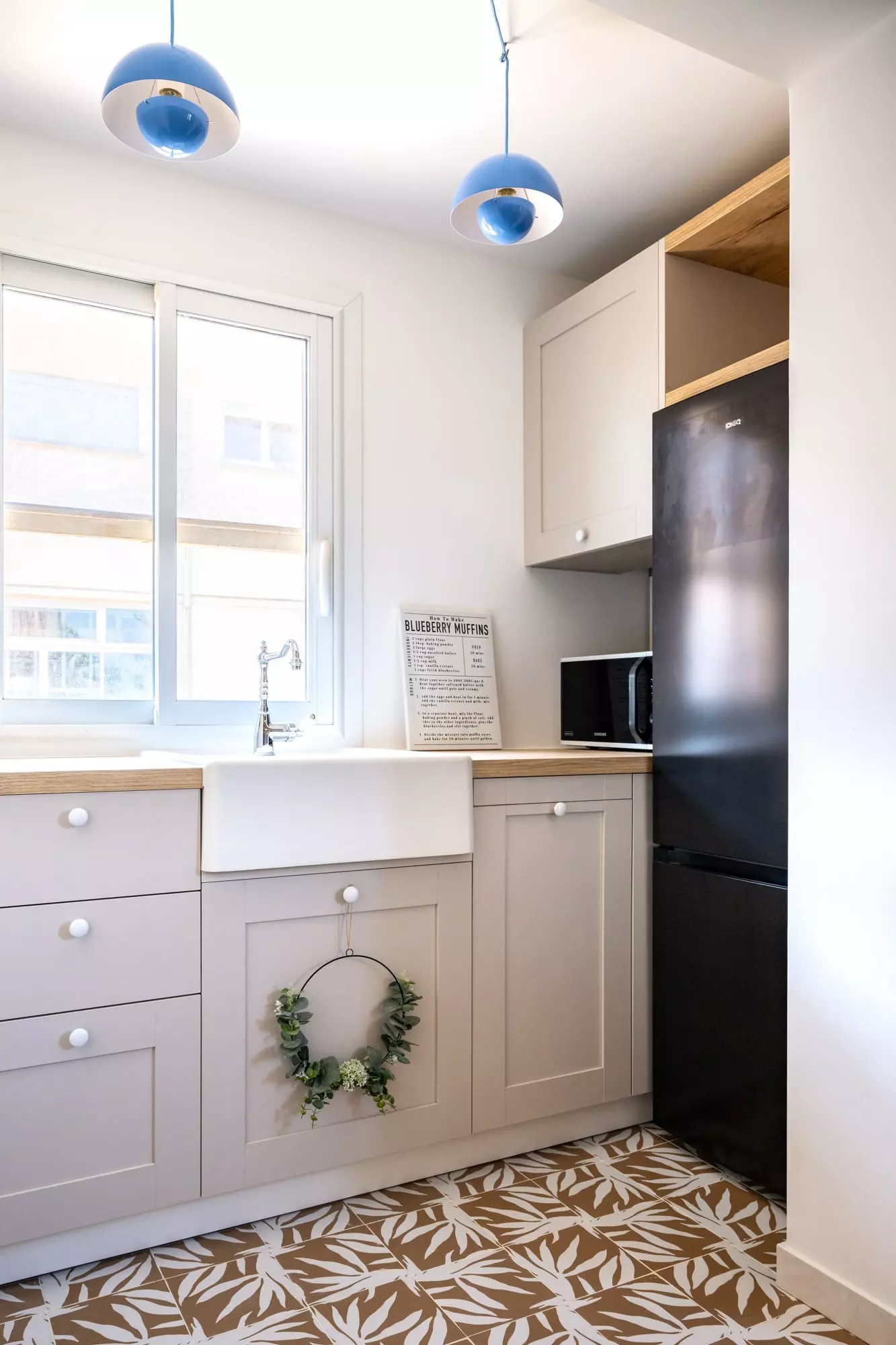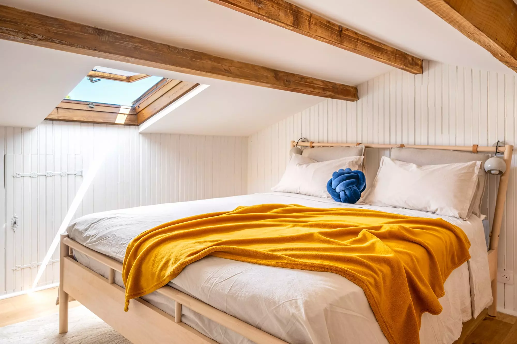 La cuisine a été entièrement repensée pour devenir un espace fonctionnel et élégant, tandis que la salle de bain a fait l’objet d’une rénovation maison ancienne Alpes-Maritimes, mariant zelliges et tomettes inspirées de l’artisanat méditerranéen. Ce mélange subtil confère à l’appartement une identité singulière, harmonieusement. où authenticité et modernité dialoguent. La mezzanine accueille désormais une chambre supplémentaire avec lit double, tandis que la pièce principale conserve une fonction conviviale et lumineuse. La chambre principale, non présentée en photo, intègre un bureau, un grand placard et un deuxième couchage double.